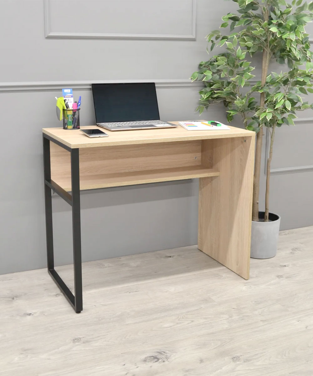 Realizat în stil loft, biroul Stydy este fabricat dintr-un ansamblu de PAL melaminat cantuit cu grosime de 18mm și un picior metalic sudat, vopsit în câmp electrostatic. Study este completată de o poliță pe interior și o duză din plastic încastrată, pentru organizarea cablurilor.